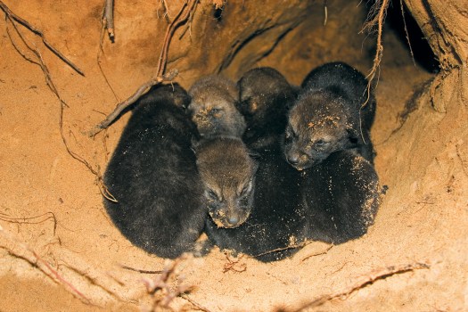 Previous Image Next Image воўчае кодла ў лісінай нары, што была пашырына бацькоўскімі ваўкамі Wolf pups in burrow-den