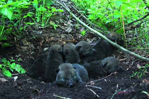 Wolf pups of couch-den on peat mound