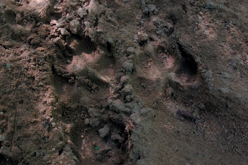 Wolf footprints at the entrance in burrow-den