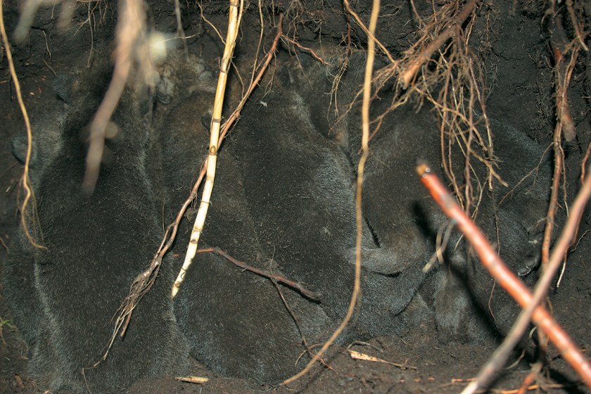 Wolf pups in the cavity-den in burrow-den in peat mound