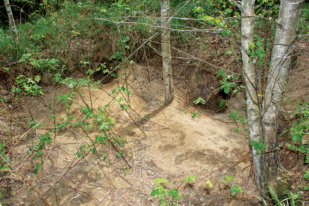 wolf burrow-den in early reforestation on clearcut