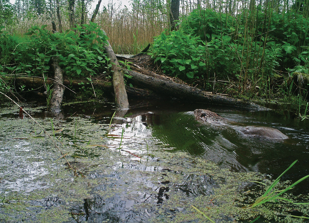 Beavers became to inhabit the variety of drainage canals in Naliboki Forest and finally all these new habitats were populated by the species. In the late 2000s and early 2010s beavers by densely occupying both rivers and numerous drainage canals inhabited Naliboki Forest with the population density of 1 to 8 settlements per 1 km2 or on the average 3-4 settlements per 1 km2 . At that time usually there was one beaver settlement per 0.8-1.2 km of river stretch and one beaver settlement per 0.5-2 km of drainage canals. In the late 2000s and early 2010s in the whole Naliboki Forest on the area of about 1.71 thousands there were about 5-7 thousand beaver settlements, where 20-40 thousand beavers lived. On small watercourses (small rivers and drainage canals) each beaver settlement has approximately from one to 4 ponds and in the majority of the cases there were 2 or 3 ponds. So, in the late 2000s and early 2010s in the whole Naliboki Forest there were about 4 thousands beaver ponds, which were full of water. Additionally, there were 2-3 thousand pond remains from the abandoned settlements of beavers.
