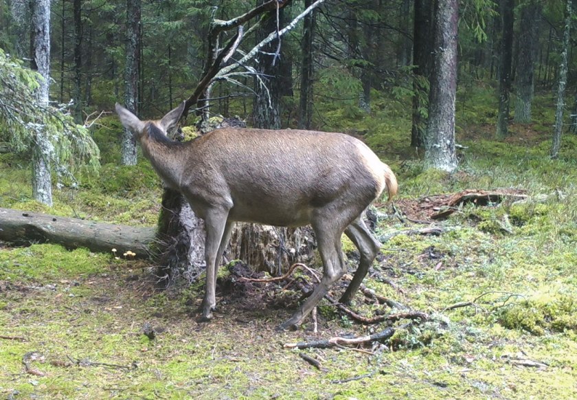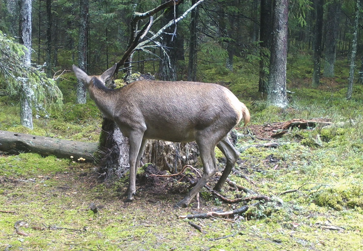 Red deer is investigating the lynx marking point by smelling