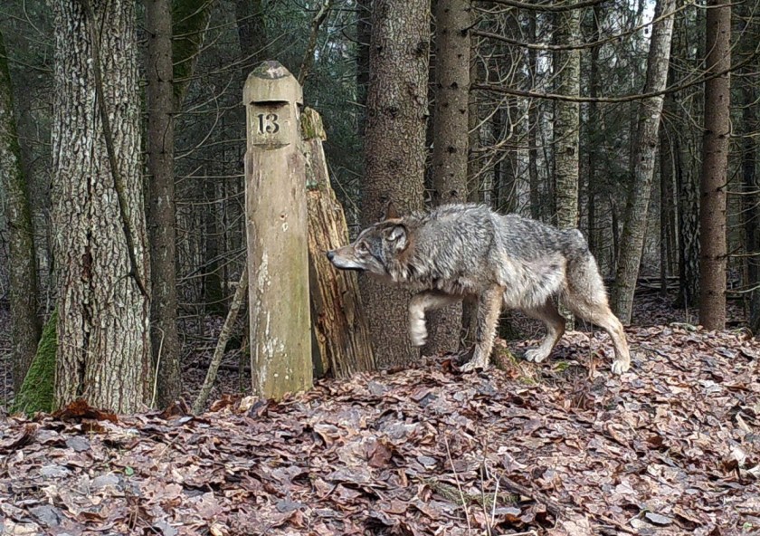 Wolf is investigating the lynx marking point with look of fear
