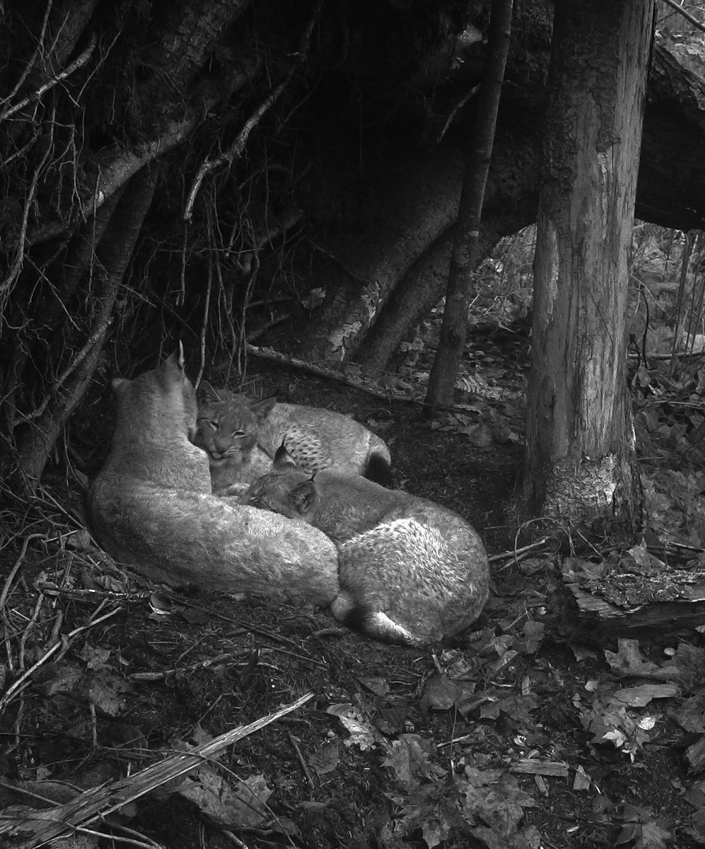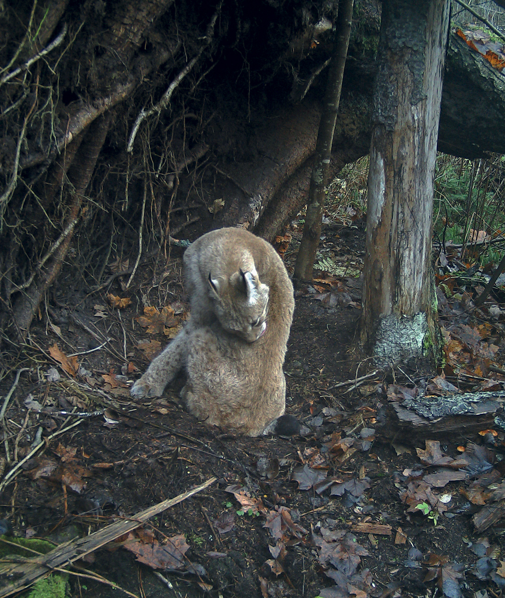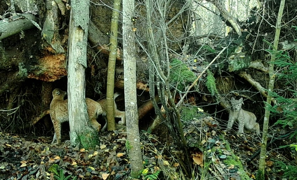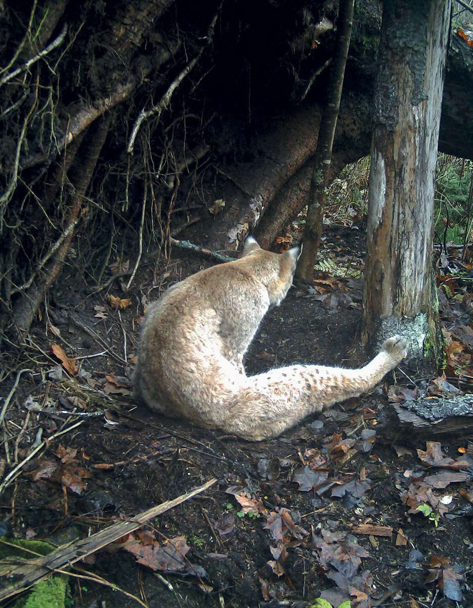 The lynx site consists of a line of five large root plates of uprooted big spruces, which are stretched at the edge of treefall. At the internal side of these root plates, it is dry and no wind usually. Along the edge of treefall just behind of the root plates there is a pathway, by which suitable prey of lynxes (roe deer, red deer (calves), wild boars (piglets), raccoon dogs, red foxes, mountain hares walk not infrequently. Moreover, nearby the lynx site at the treefall edge a small recent clearcut situated. In this clearcut with early reforestation the above-mentioned potential prey of lynxes feed often. So, the lynxes that stay in the site at uprooted spruces can rest, groom, sleep and use an ambush hunting at the same time. In the site several trunks of fallen trees situated about two metres as high. Additionally in the treefall nearby the lynx site there are standing trees. Therefore, kittens staying in the spot can escape on the height easily, if there is a danger.