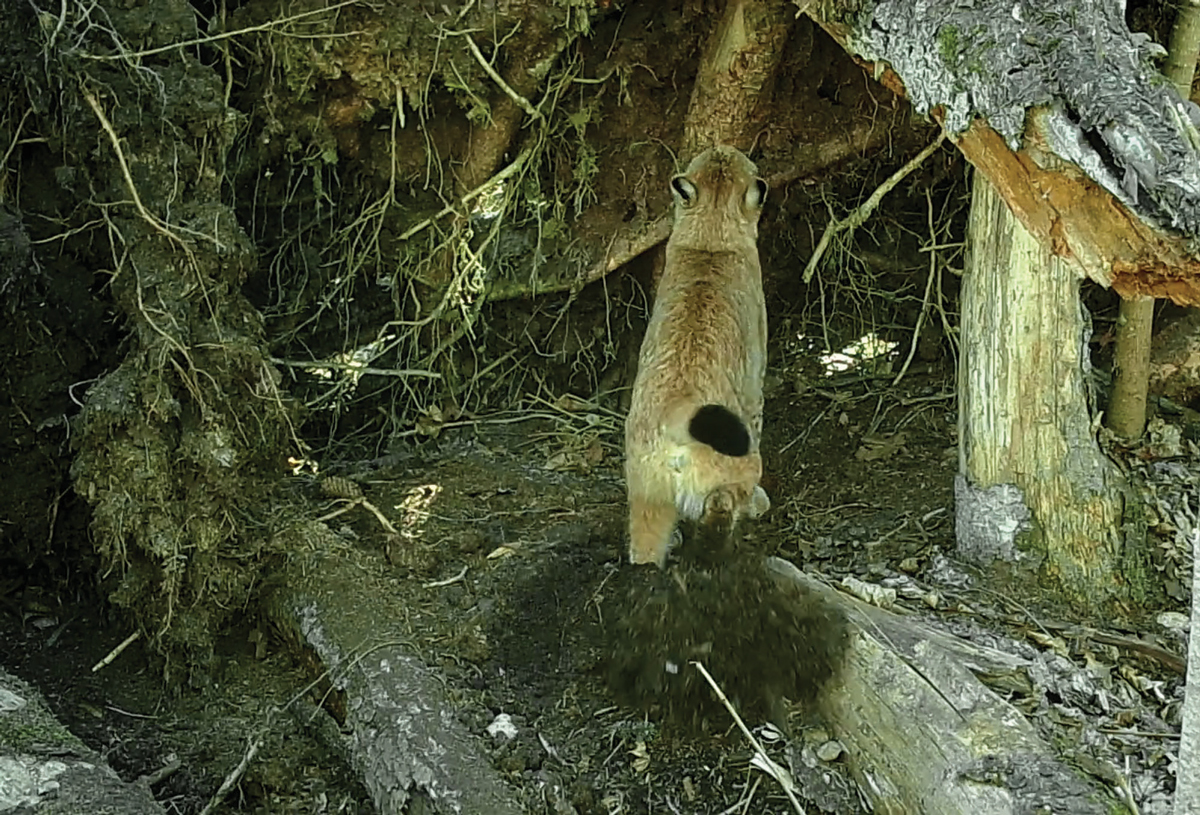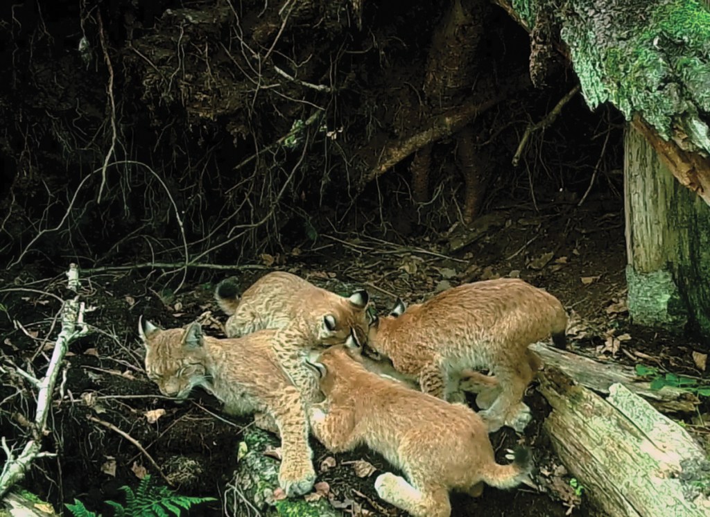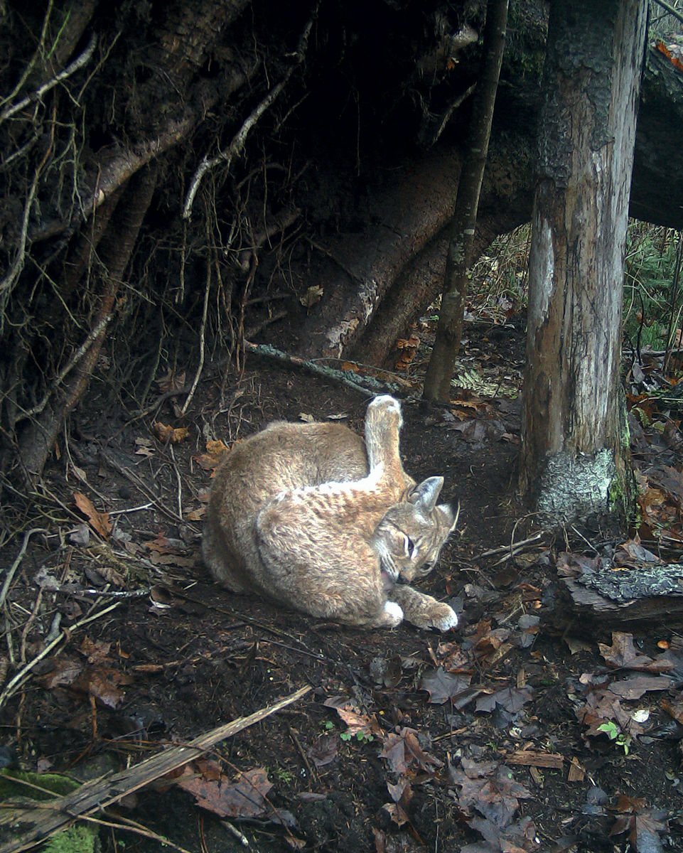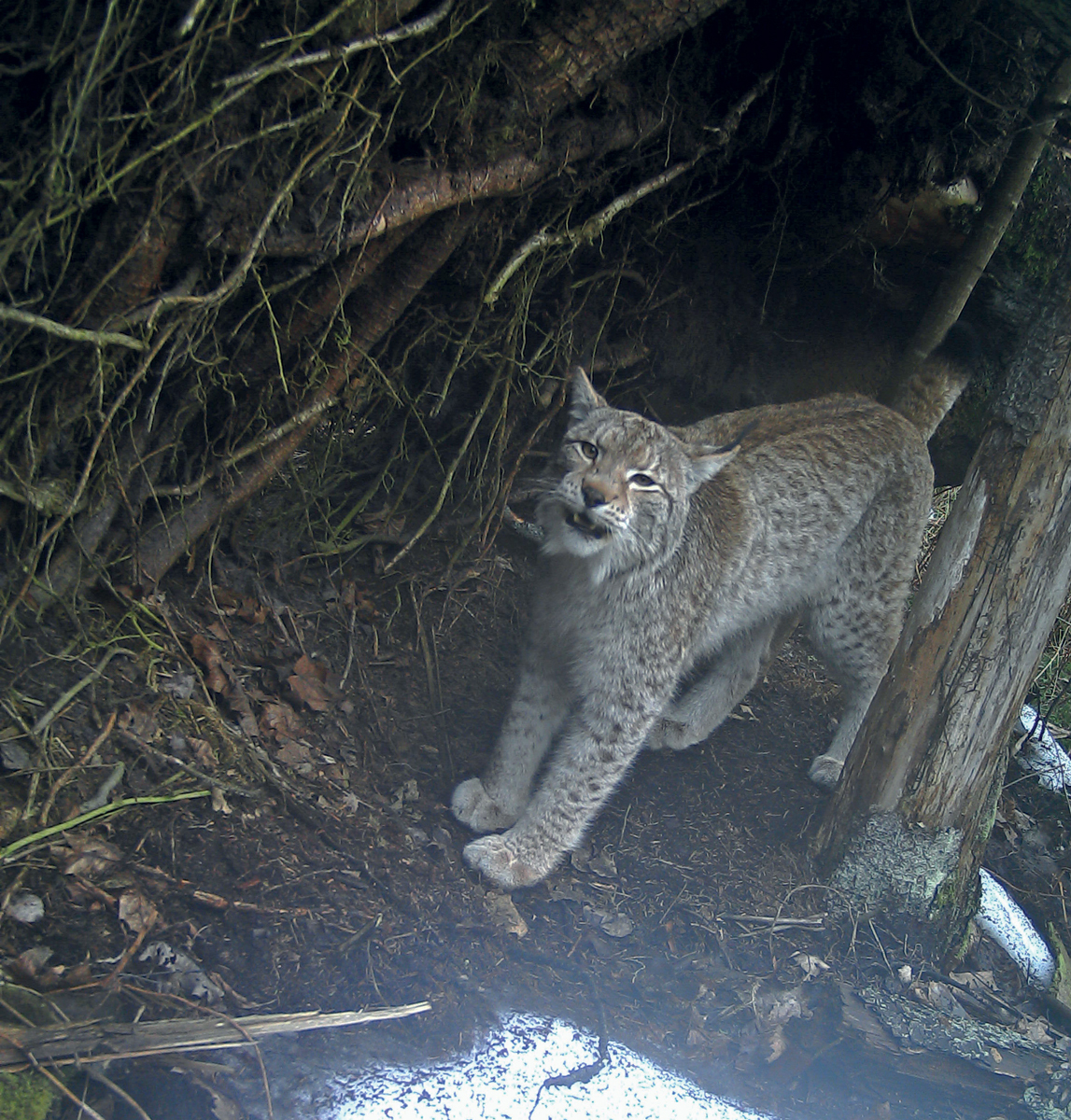 The lynx site consists of a line of five large root plates of uprooted big spruces, which are stretched at the edge of treefall. At the internal side of these root plates, it is dry and no wind usually. Along the edge of treefall just behind of the root plates there is a pathway, by which suitable prey of lynxes (roe deer, red deer (calves), wild boars (piglets), raccoon dogs, red foxes, mountain hares walk not infrequently. Moreover, nearby the lynx site at the treefall edge a small recent clearcut situated. In this clearcut with early reforestation the above-mentioned potential prey of lynxes feed often. So, the lynxes that stay in the site at uprooted spruces can rest, groom, sleep and use an ambush hunting at the same time. In the site several trunks of fallen trees situated about two metres as high. Additionally in the treefall nearby the lynx site there are standing trees. Therefore, kittens staying in the spot can escape on the height easily, if there is a danger.