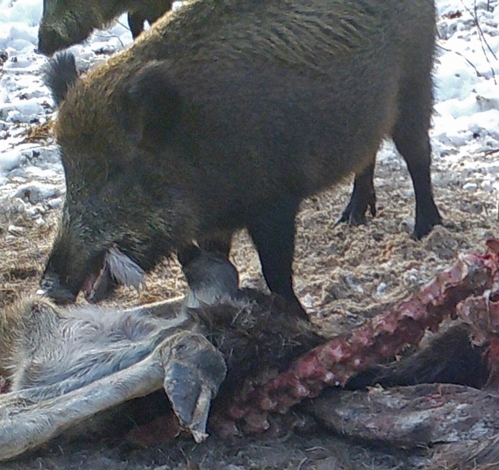 We watched the carcasses throughout the winter. Wild boars, ravens, and eagles consumed most of the elk carcass in the glade. Other scavengers, such as red foxes, raccoon dogs, pine martens, minks, polecats, weasels, jays, and wolves, also came by, but they had a minor role in eating the carcass. See some of the photos below.