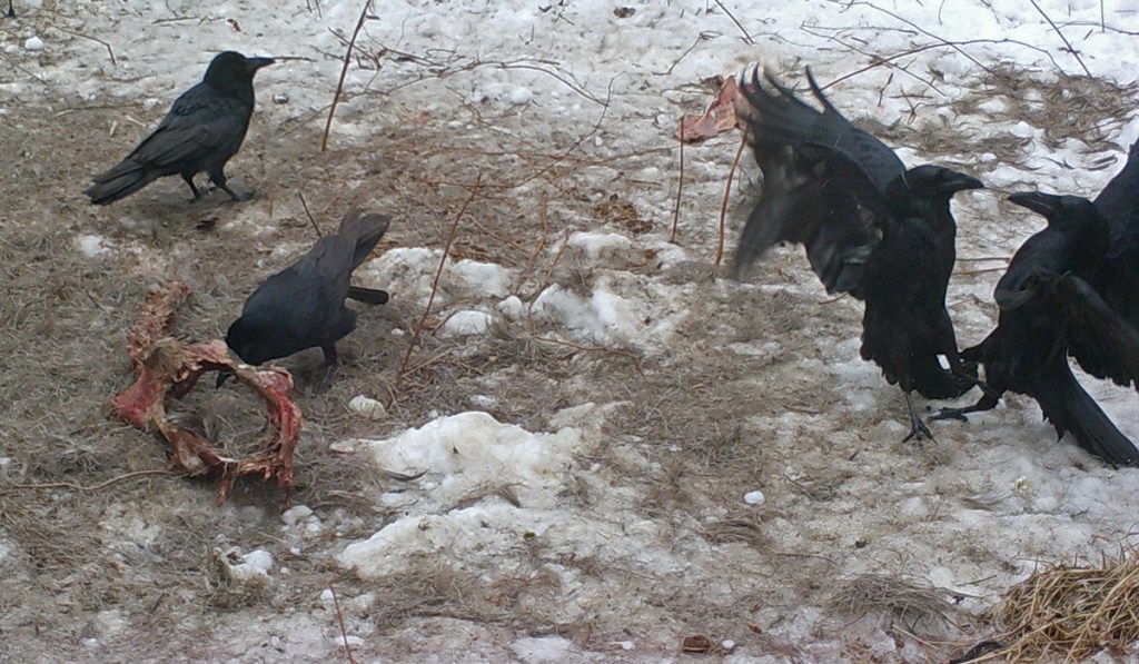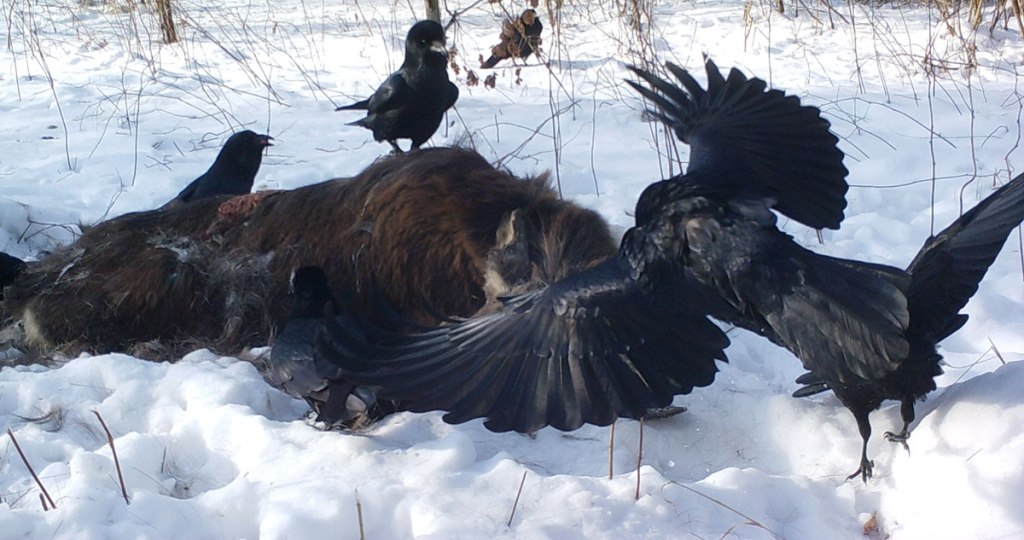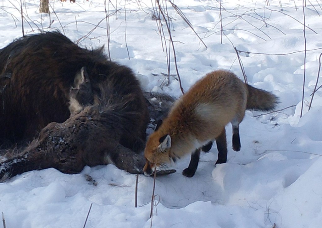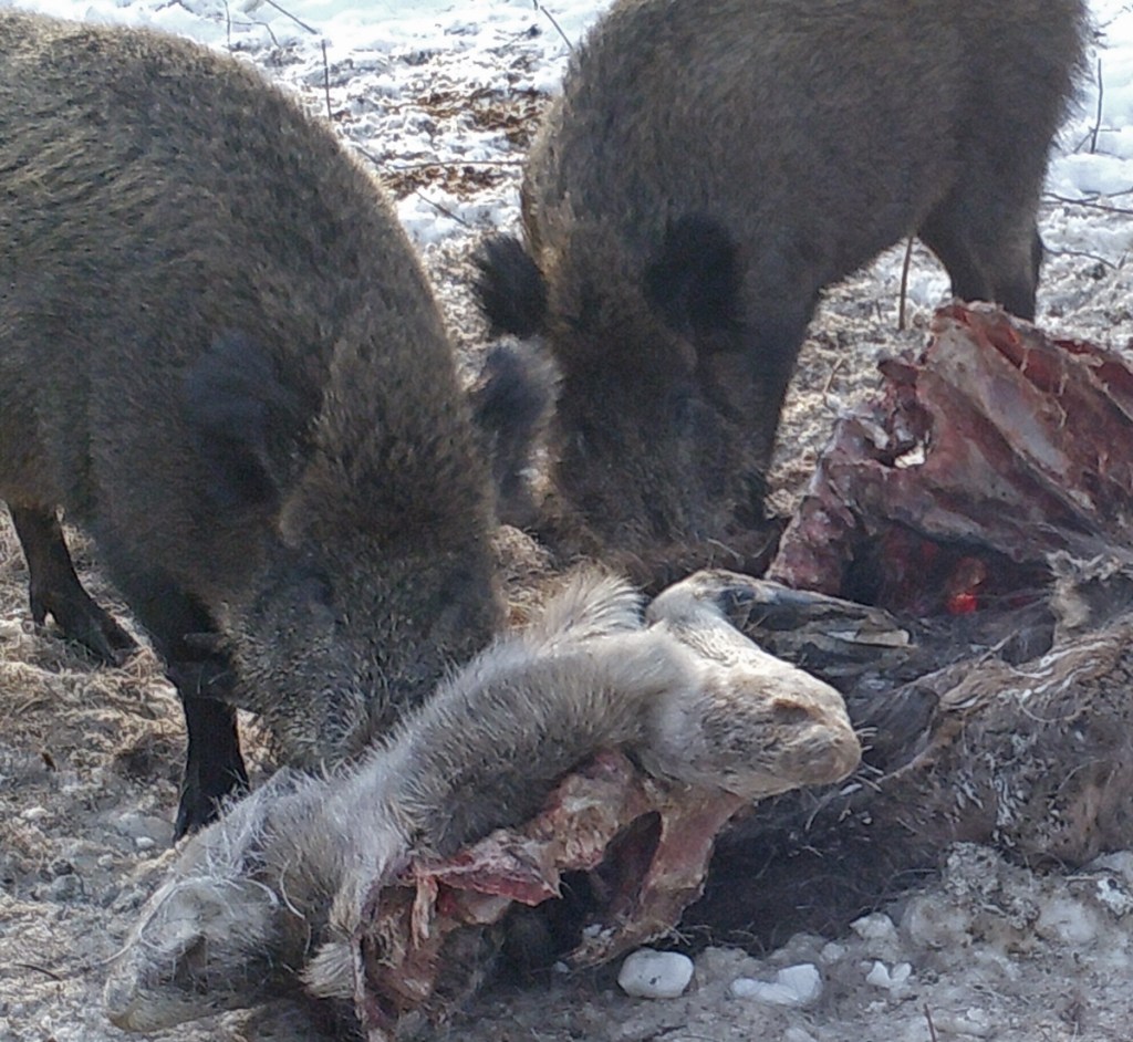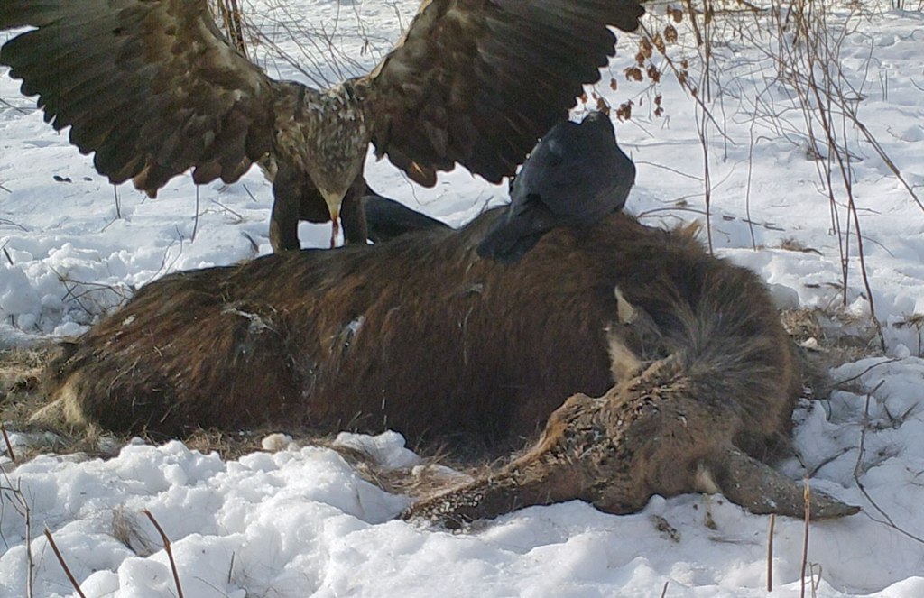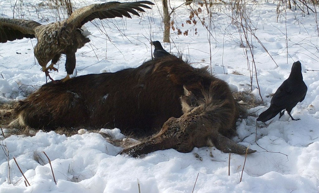 Both elks died in early winter, but under different circumstances. In the first case: a poacher shot a big female elk, but she escaped and died later. Her body lay in a small glade, visible from the forest edge and the sky. In the second case: a brown bear killed a big male elk and hid his body under the pine tree canopy in a boggy area. The two carcasses were slightly more than 2 km apart, so we expected the same scavengers to visit them.