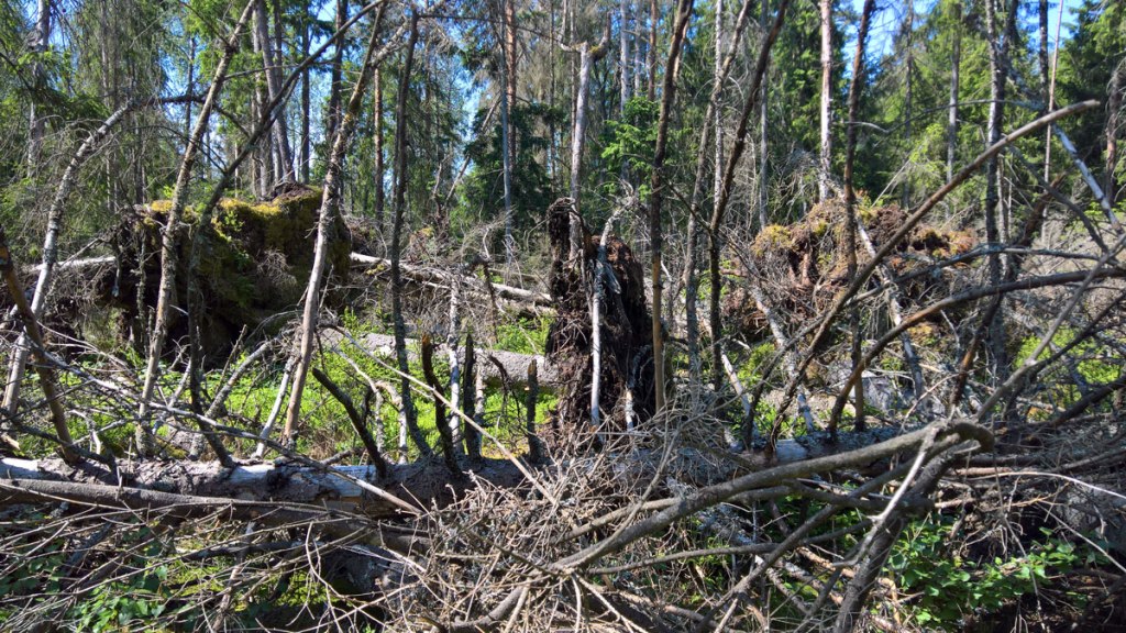 In mid-May 2023, an adult female lynx, whom we refer to as Mikhalina, gave birth within a densely layered treefall spanning approximately three hectares. She had three kittens. The following two photos depict the treefall.
